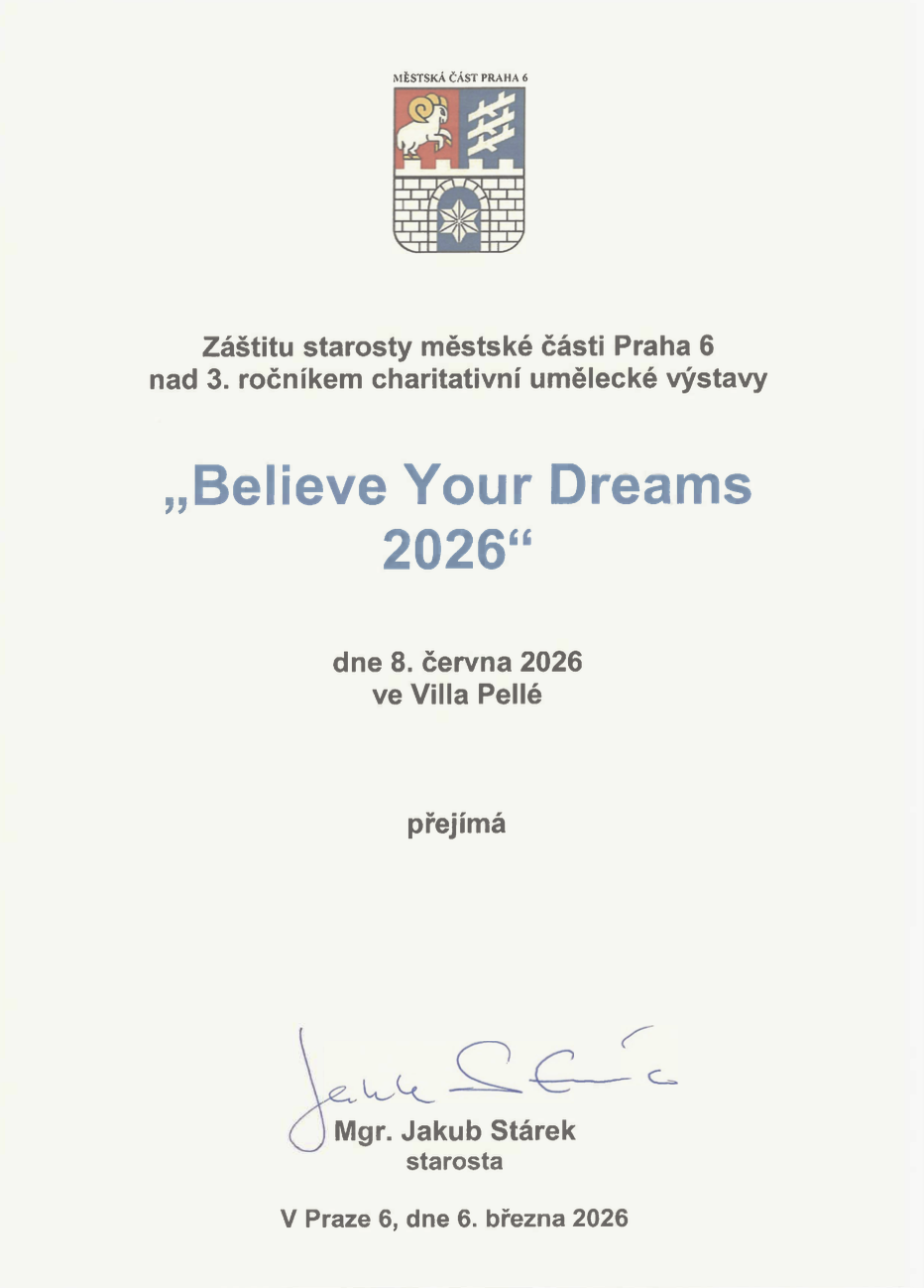 S velkou ctí oznamujeme, že záštitu nad 3. ročníkem charitativní výstavy Believe Your Dreams 2026 převzal starosta městské části Praha 6, Mgr. Jakub Stárek.